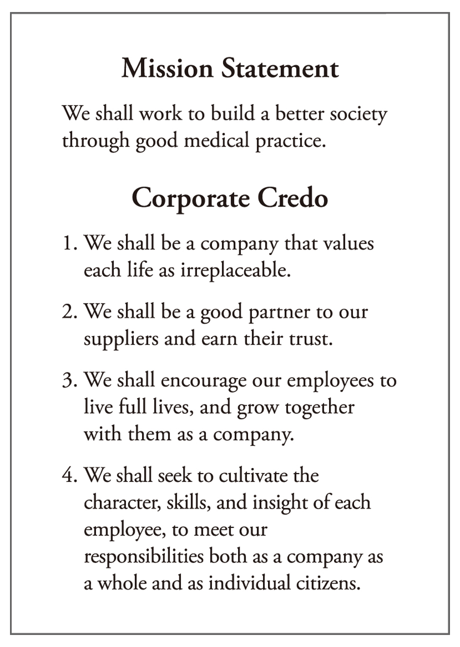 Mission Statement is the mission of the Sogo Medical Group, while the Corporate Credo are the promises and pledges we make to society.