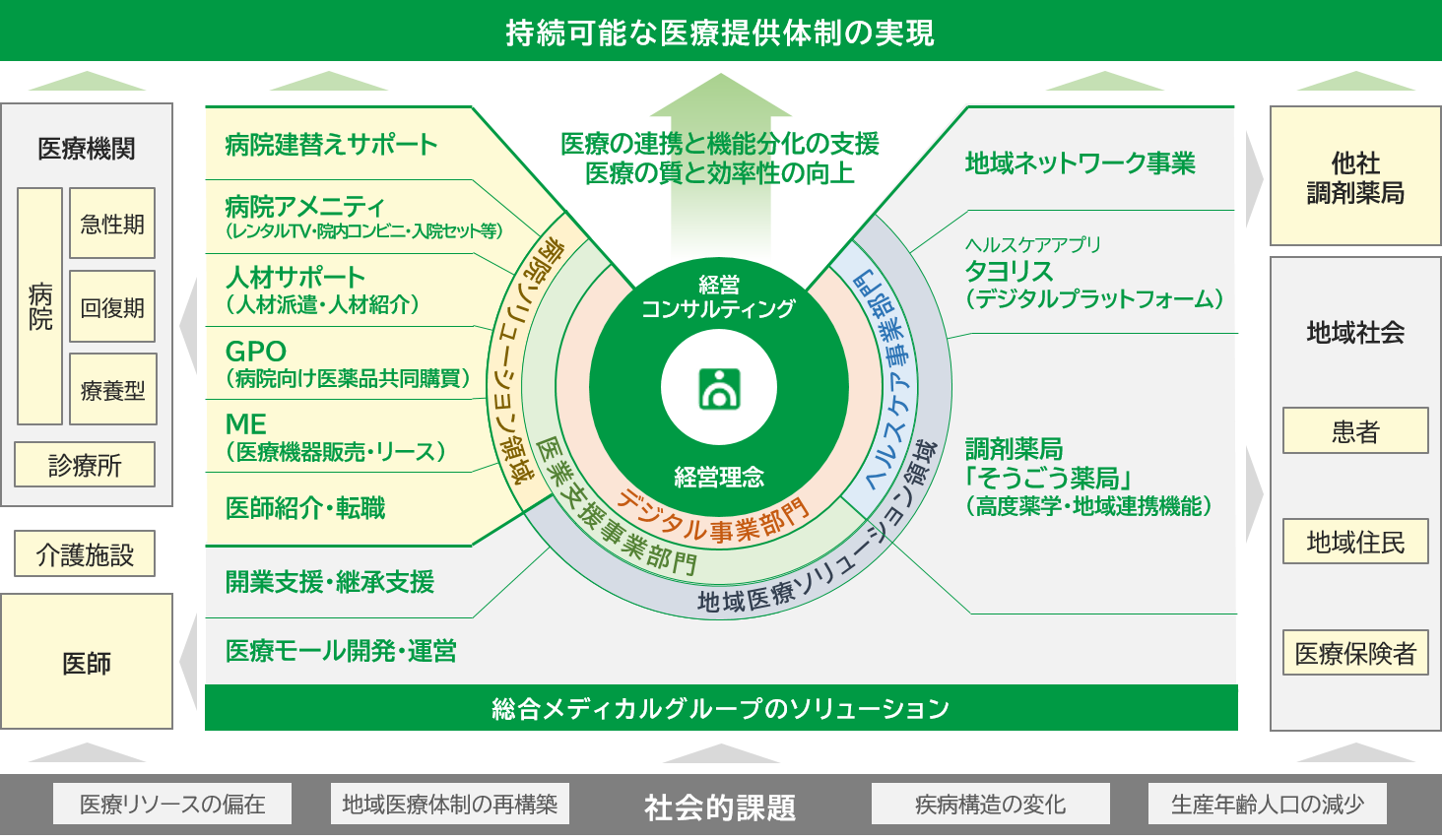 地域社会や医療機関が抱える課題を共有し、当社グループのソリューションをベースにそれぞれの分野に求められる価値を提供することにより、持続可能な医療提供体制の構築に貢献してまいります。