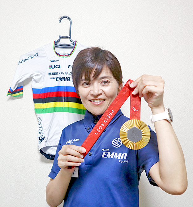 杉浦佳子選手は、大学卒業後、薬剤師として勤務しながら自転車競技に取り組んでいました。2013年にはスポーツファーマシストの資格を取得。薬学的知識を活かしてアスリートのサポートや講演活動に尽力していました。2016年、ロードレース大会中に落車し、医師からは回復は難しいと診断を受けるほどの重傷を負うも懸命なリハビリを重ね、2017年にパラサイクリング選手として奇跡的にレースへ復帰。東京2020パラリンピックにて、女子個人ロードタイムトライアルと女子個人ロードレースで金メダルを獲得。その後も、世界選手権などさまざまな世界大会で優秀な成績をのこし、2024年のパリ2024パラリンピックでは2大会連続の金メダルを獲得しました。同時に、杉浦佳子選手自身が持つ日本人の最年長金メダル獲得記録を53歳に更新しました。また、科学技術分野における発明・発見や、学術及びスポーツ・芸術文化分野優れた業績を挙げた人に授与される紫綬褒章を2度受章しています。