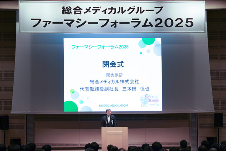 総合メディカルの代表取締役社長 多田荘一郎は、「患者さん・医療機関・社会にとって必要とされ、これからの薬局の在り方を変えるためにはもっと成長が必要となる。そのためには一人ひとりの成長も重要である」とし、日頃の研鑽結果を発表するファーマシーフォーラムの開催意義を強調しました。