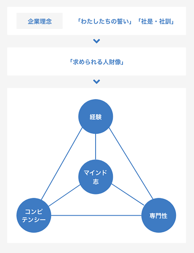 総合メディカルグループでは「求められる人財像」を職種・等級ごとに定義し、さらに、求められる人財像に近づくための育成施策として、「4つの育成視点」を持って教育体系を構築しています。